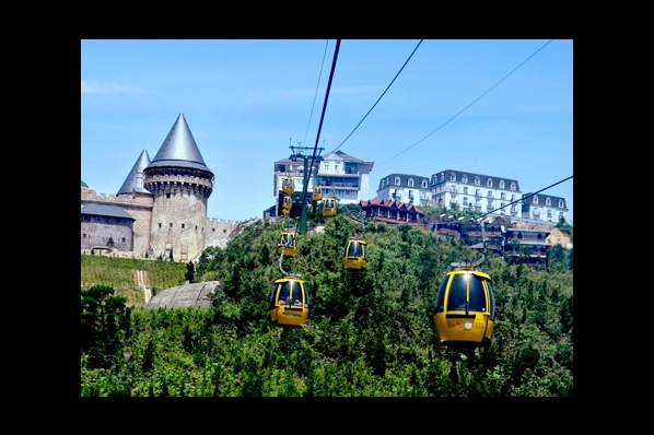 - Đoàn lên cáp treo và sẽ mất 20 phút trên cabin để lên đỉnh núi Bà Nà thời gian này du khách có thể chụp hình toàn cảnh núi rừng Bà Nà, thành phố Đà Nẵng xa hơn là Ngũ Hành Sơn.